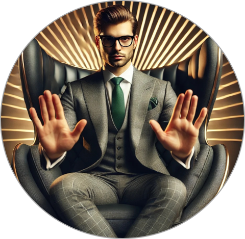 A man in a gray suit with a green tie and glasses sitting on a futuristic chair with a glowing, radiating background, holding his hands in front of him.